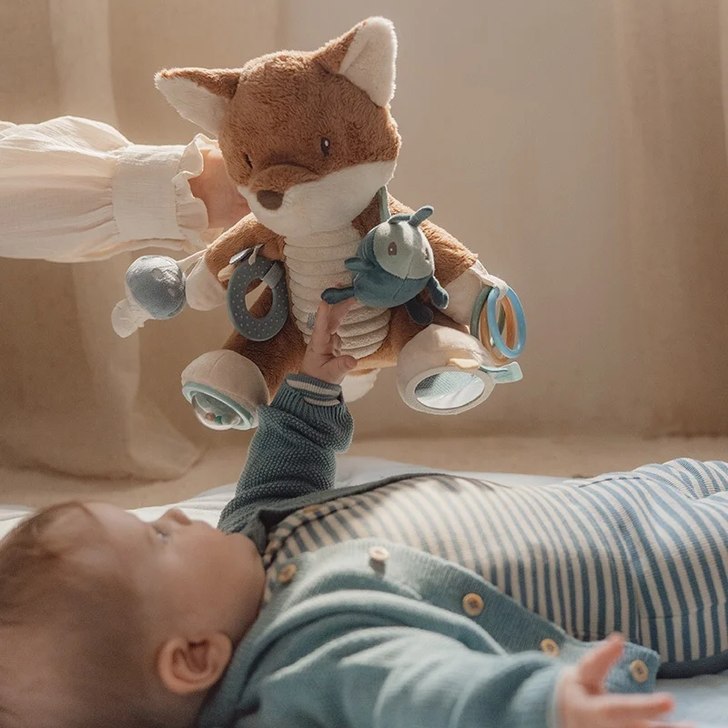 This lovely fox promises more than just cuddles. Discover all the engaging activities that it hides. There’s a crinkly beetle on its shoulder, a rattling sound, labels and an acorn and mushroom to touch and feel. The rings around the leg and the mirror on one foot – so many details to spark your little one’s curiosity