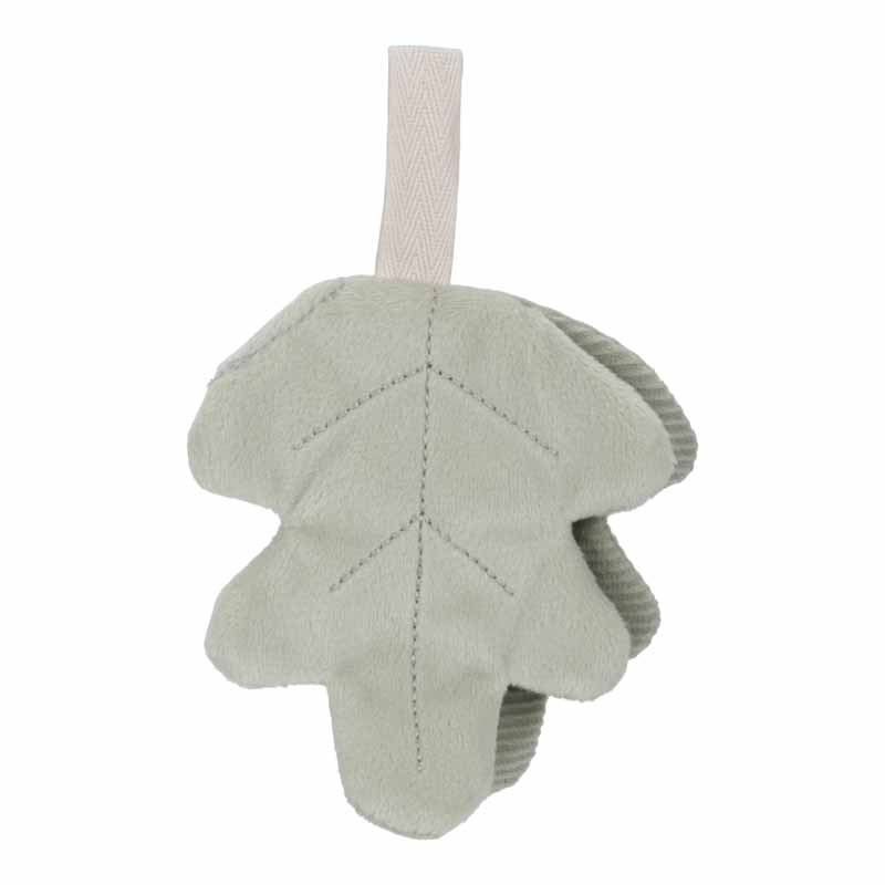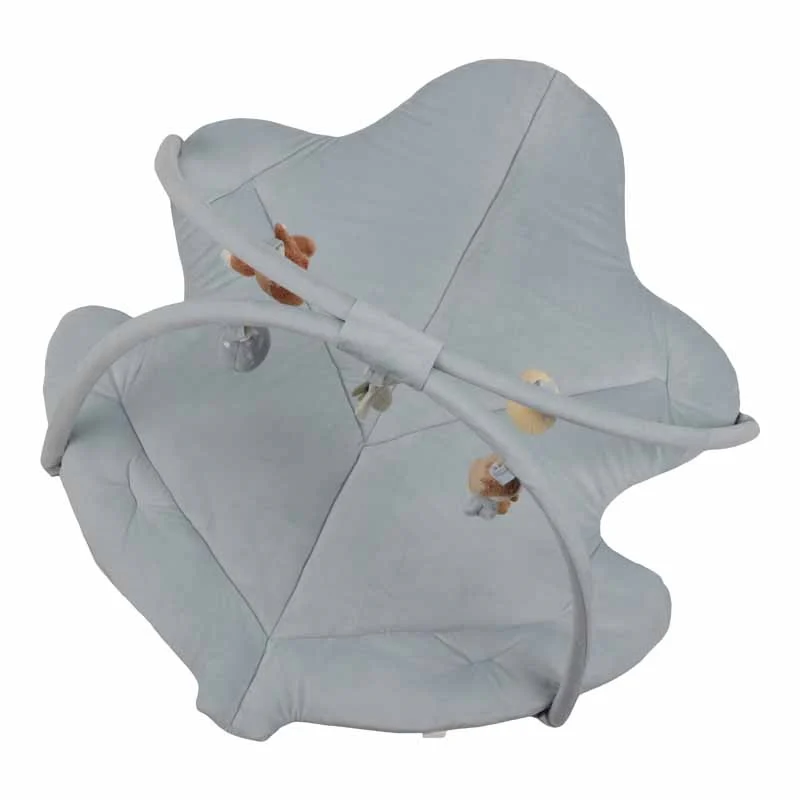 This leaf-shaped activity mat in a soft blue tone has two large arches with 5 different cuddly toys. So much to see, feel, and hear. The fox, wise owl, yellow and blue mushroom and leave will help little ones develop sensory skills and stimulate hand-eye coordination