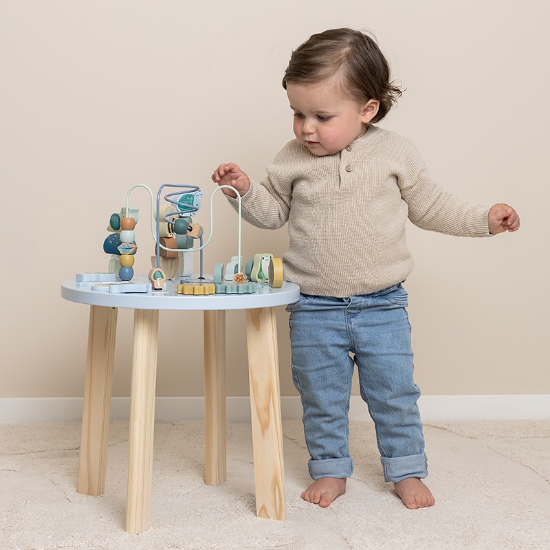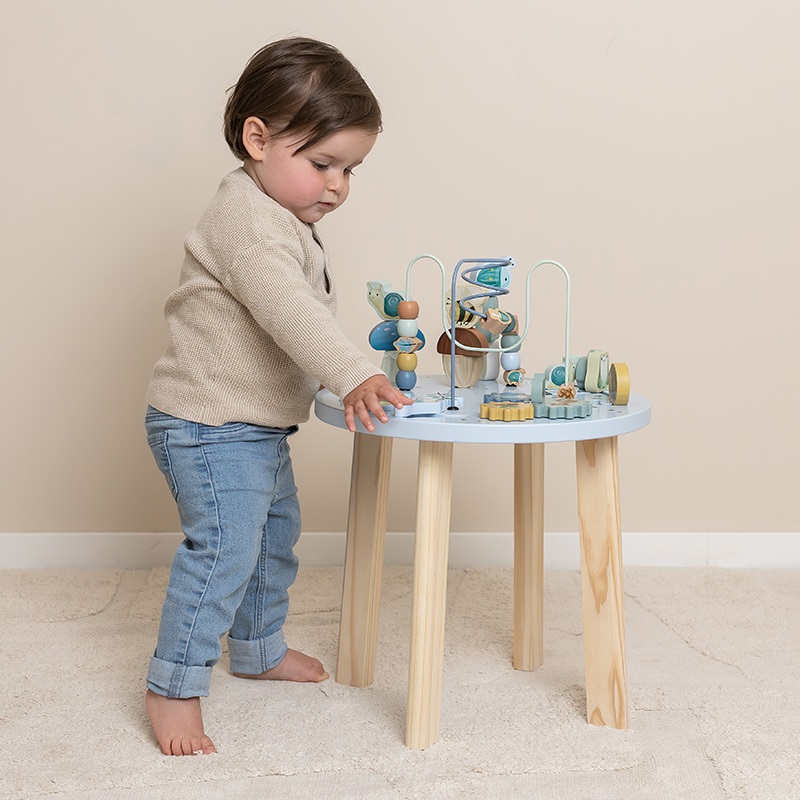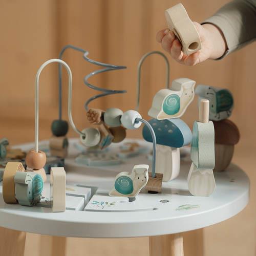 Discover the many activities this table has to offer. Bring the beads along the spiral from one side to the other, build a tower and fill the forest with trees. Complete the puzzle, turn the wheels and help the lovely animals cross the forest. This wooden multi-activity table challenges your little one in many ways. There are 5 activities to explore that each support the development of fine motor skills. Thanks to the safe and balanced design, the activity table also encourages standing up