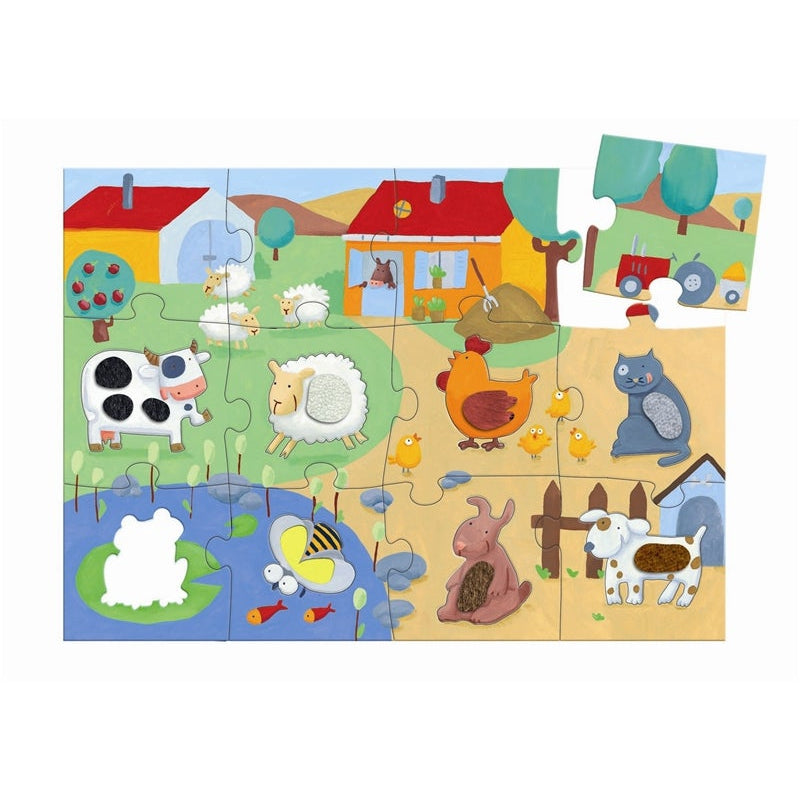 بازل مميّز يضم 12 قطعة من حيوانات المزرعة، حيث يمكن تركيب كل حيوان بشكل منفصل ولمسه بفضل الخامات اللمسية المختلفة. القطع متينة وسهلة الاستخدام، مصنوعة من كرتون عالي الجودة.