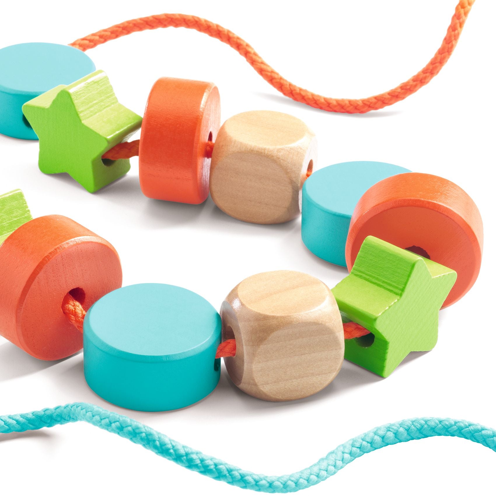 مجموعة رائعة تحتوي على 24 قطعة خشبية ملونة يمكن تمرير الخيط بينها أو تكديسها. لعبة مليئة بالإمكانيات الإبداعية التي تجمع بين المرح والتعلم.
